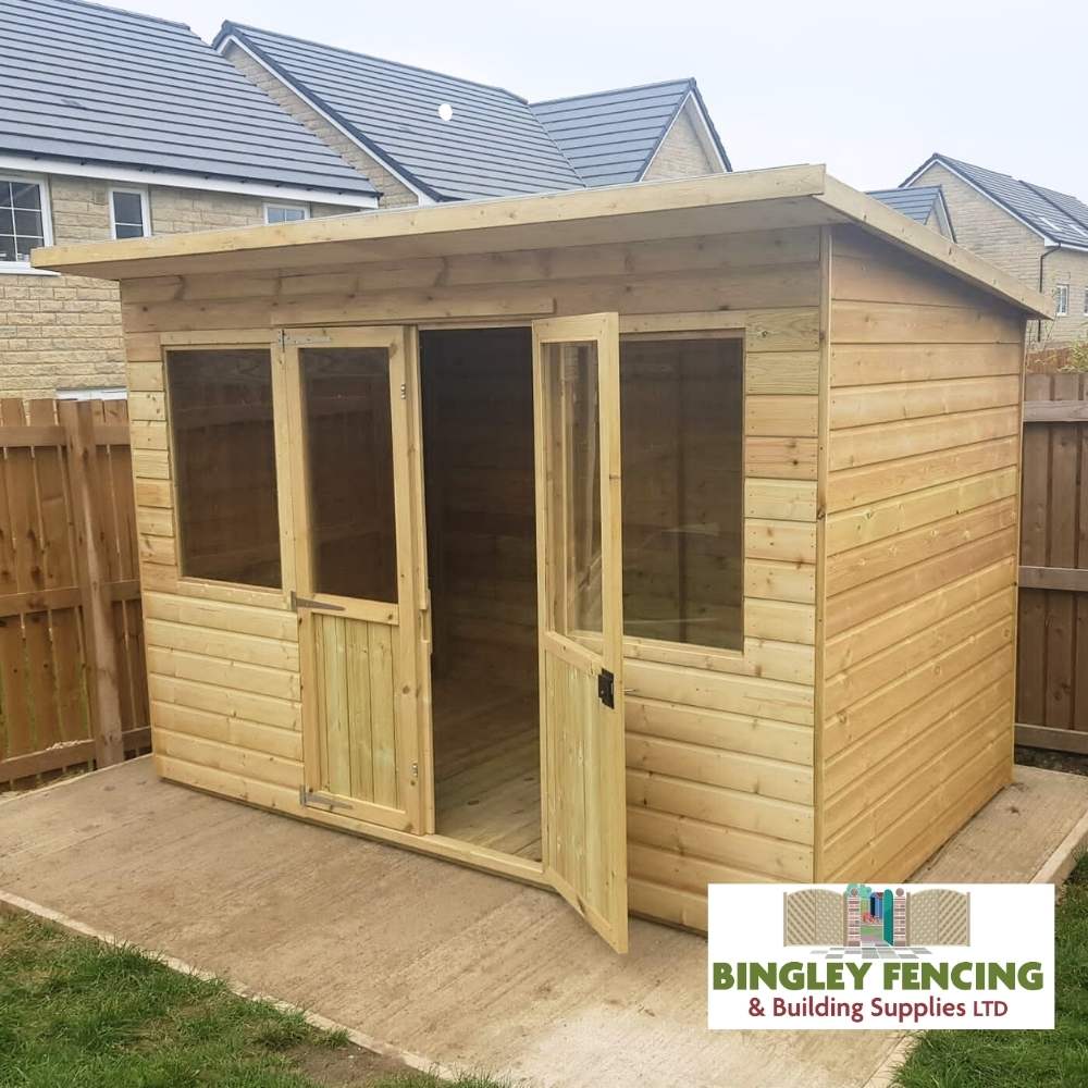 This summerhouse features a pent style sloping roof which gives more internal head room.